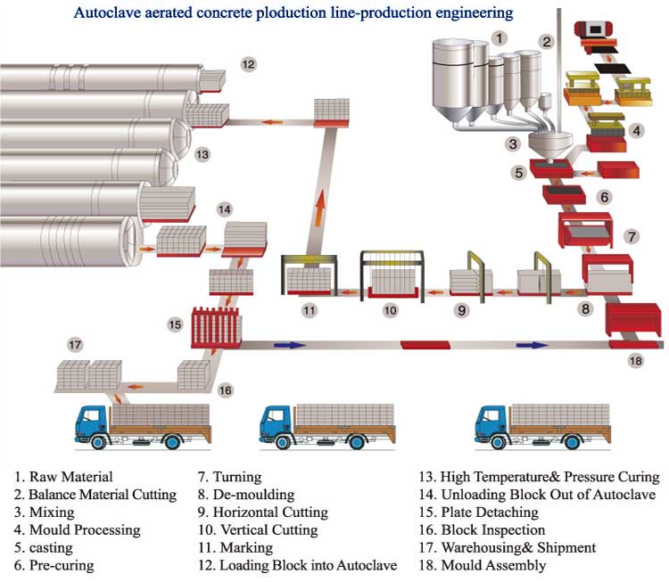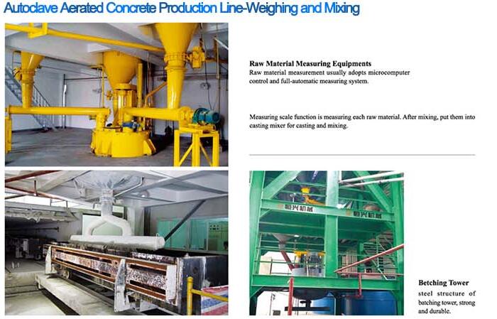 Autoclaved Aerated Concrete Production Line (AAC) is a lightweight brick production machinery and equipment, commonly known as aerated block device or aerated brick production line. It is based on cement, lime, slag, fly ash, sand, hair air materials as raw materials, grinded ingredients, pouring, cutting, steam curing conservation and milling processes made of. After gas evolution because of its internal product contains a lot of uniform and fine pores, hence the name of aerated concrete block. It is light weight, good insulation properties and processability, etc.,